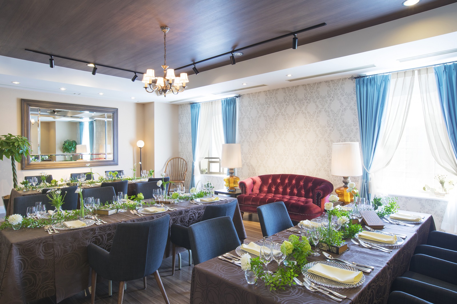 こだわりのインテリアが配された「プティ・エール」。エレガントな邸宅でゆったりと寛ぐようなパーティが実現。