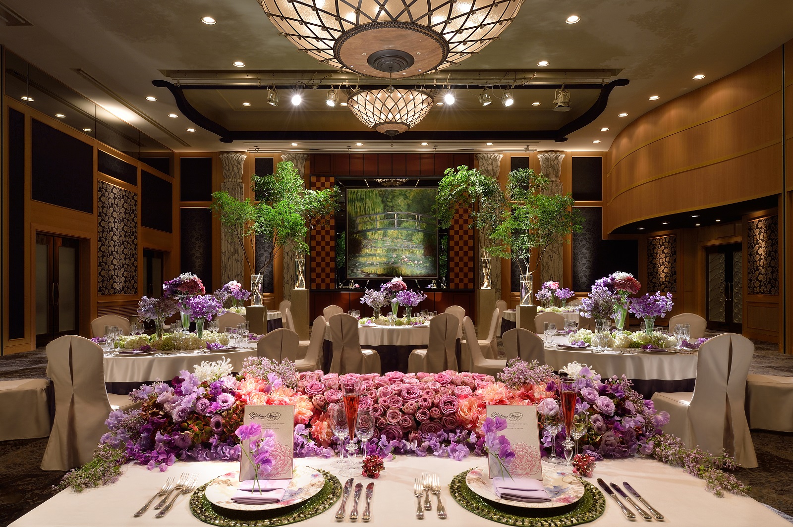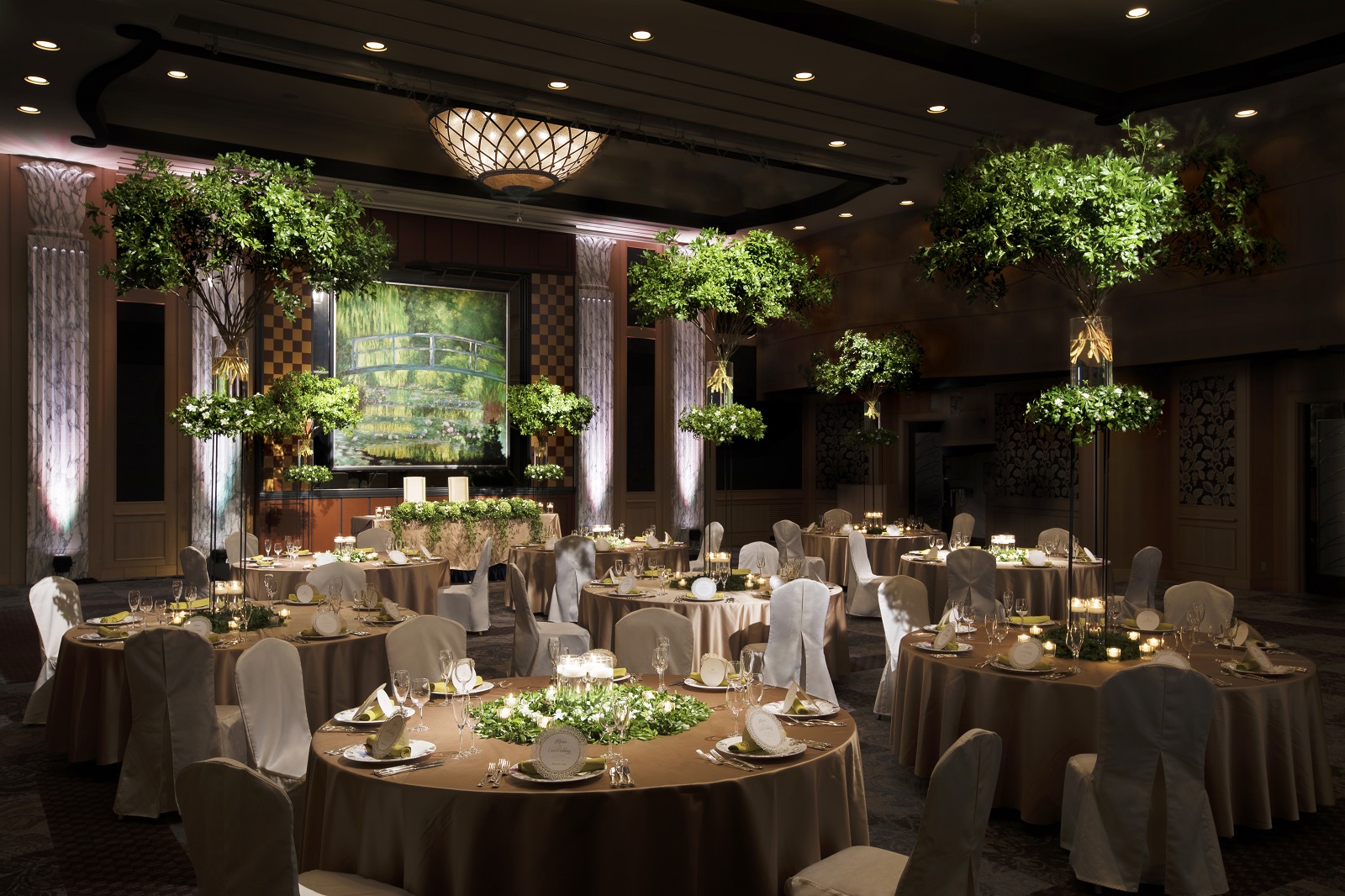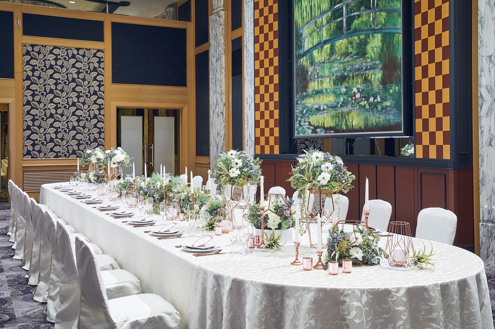 2フロア吹き抜けの開放的な「ローズルーム」は180名まで収容可。壁に飾られた画家モネの「睡蓮」が印象的。