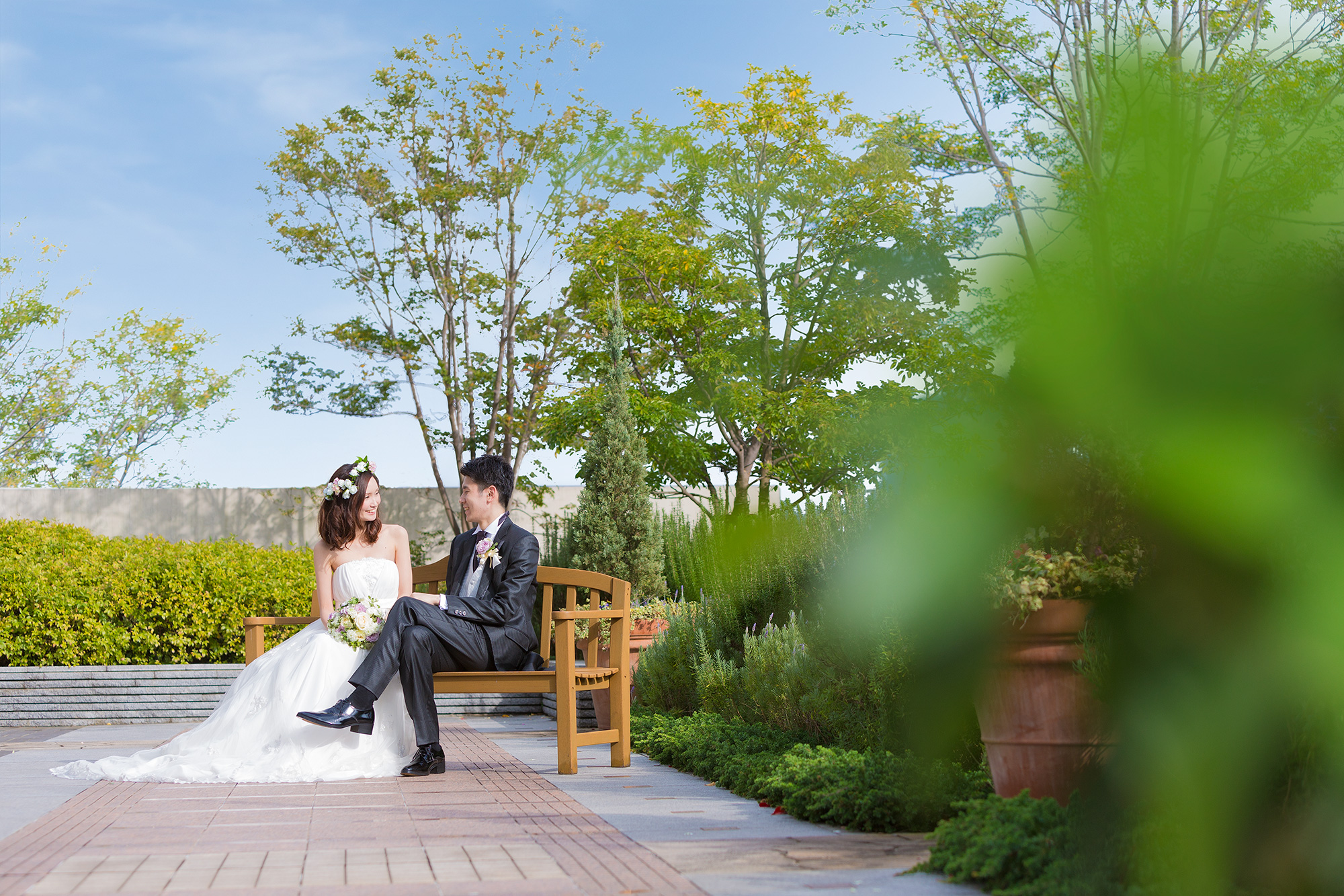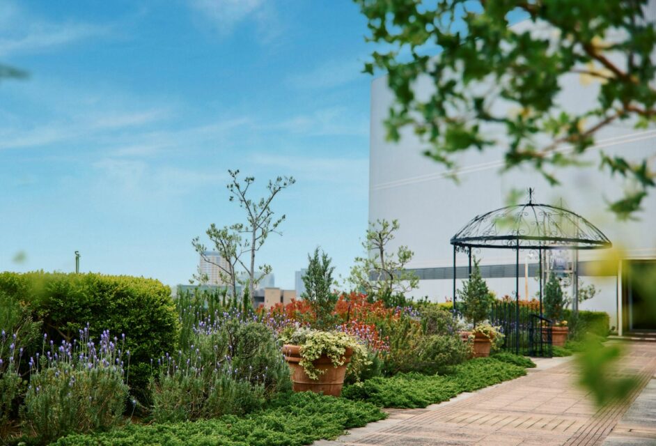 ホテル9階には神戸の街を一望できるガーデンも。季節の草花に囲まれてアフターセレモニーを楽しんで。