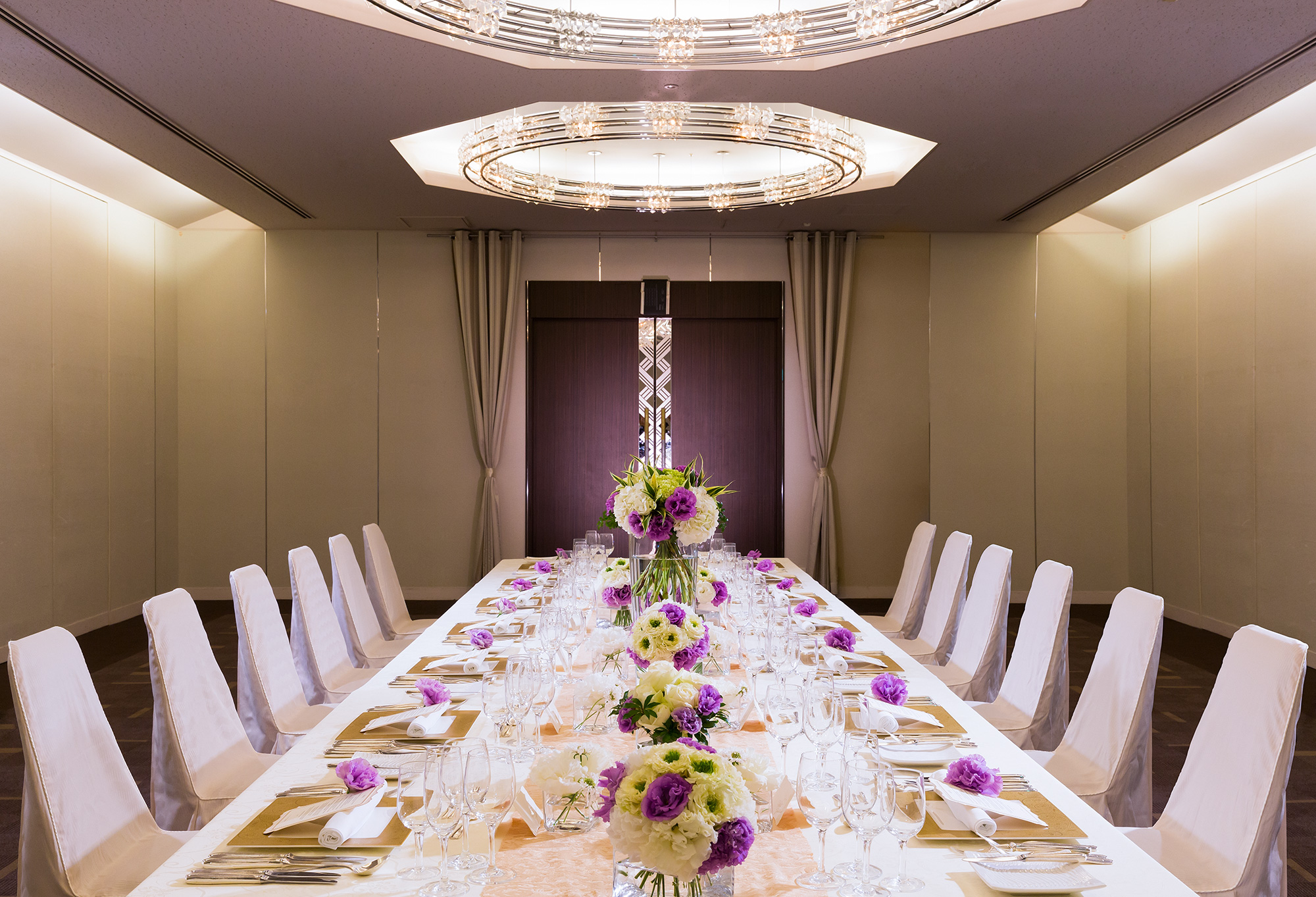 シャンデリアの華やぎのもと、ふれ合いを大切にした温かな祝宴が叶う「カモミール」。着席~36名。