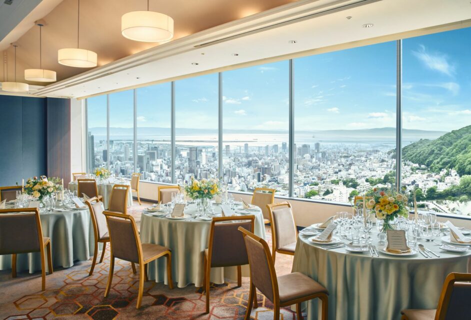 スカイバンケット「アーバンウィンド」。六甲の緑、街並み、ベイエリアまで神戸市街を一望。着席~90名。