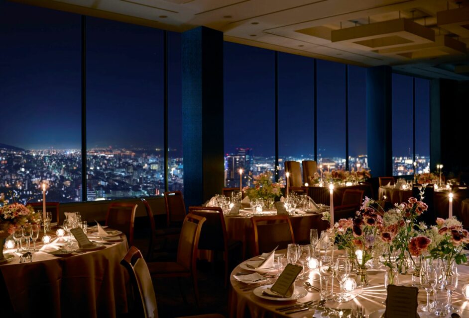 ホテル35階「アーバンウィンド」のナイトウェディングなら、宝石箱のように煌めく神戸の夜景もおもてなしに。
