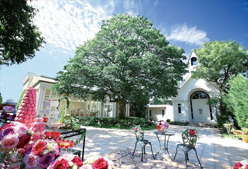 樹齢300年のモチノキが見守る「アンジュ・デ・ラヴィ」。閑静な敷地内には、オフホワイトのチャペル、オープンテラス付きパーティルーム、緑あふれるガーデンがあり、そのすべてを貸し切って、大切な人たちとプライベートで特別な時間を過ごすことができる。挙式は温もりを感じるチャペル、または木漏れ日が眩いガーデンをセレクト。ガーデンではフラワーシャワーやバルーンリリースなどの演出を行うことも。自由度の高い邸宅で、ふたりらしいウェディングを。