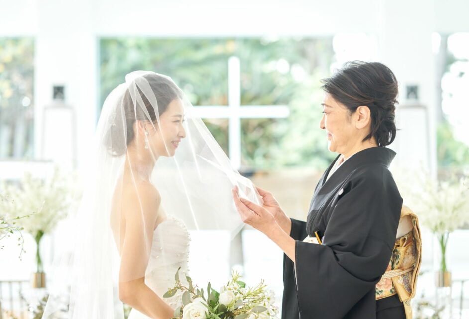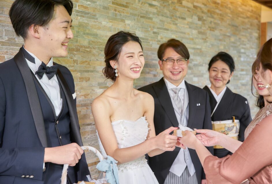 家族との演出を取り入れて、家族挙式ならではの温かなひと時を。美しい光がふたりとゲストを祝福。