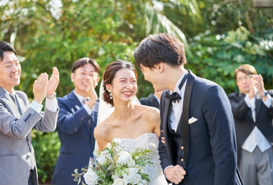 挙式後はチャペルに面した「ベルガーデン テラッツァ」でのフラワーシャワー。花木に囲まれて開放的な時間に。