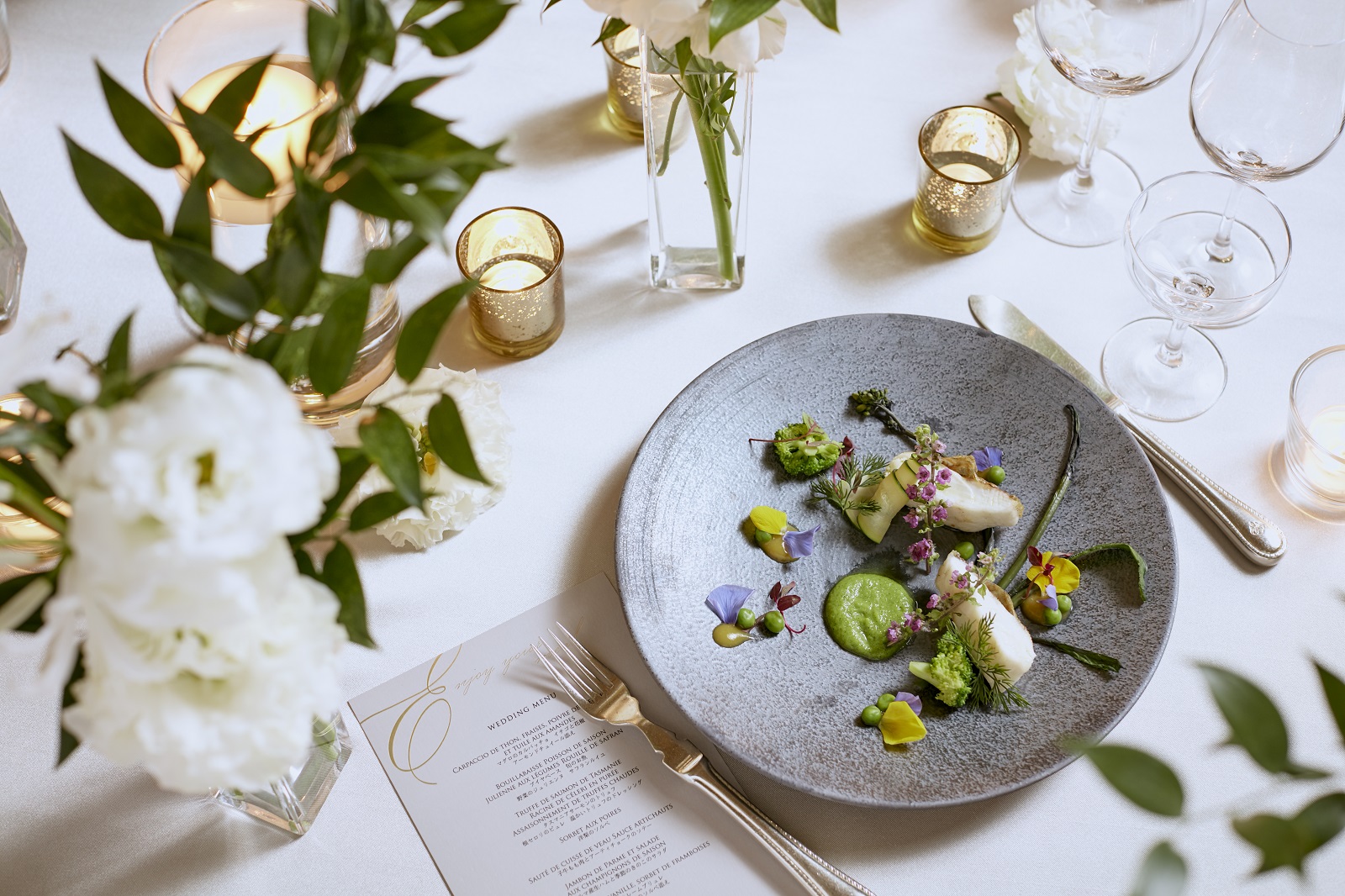 一皿一皿に真心をこめて、シェフが腕によりをかけた婚礼料理でおもてなし。上質な素材を使い、目にも鮮やか。