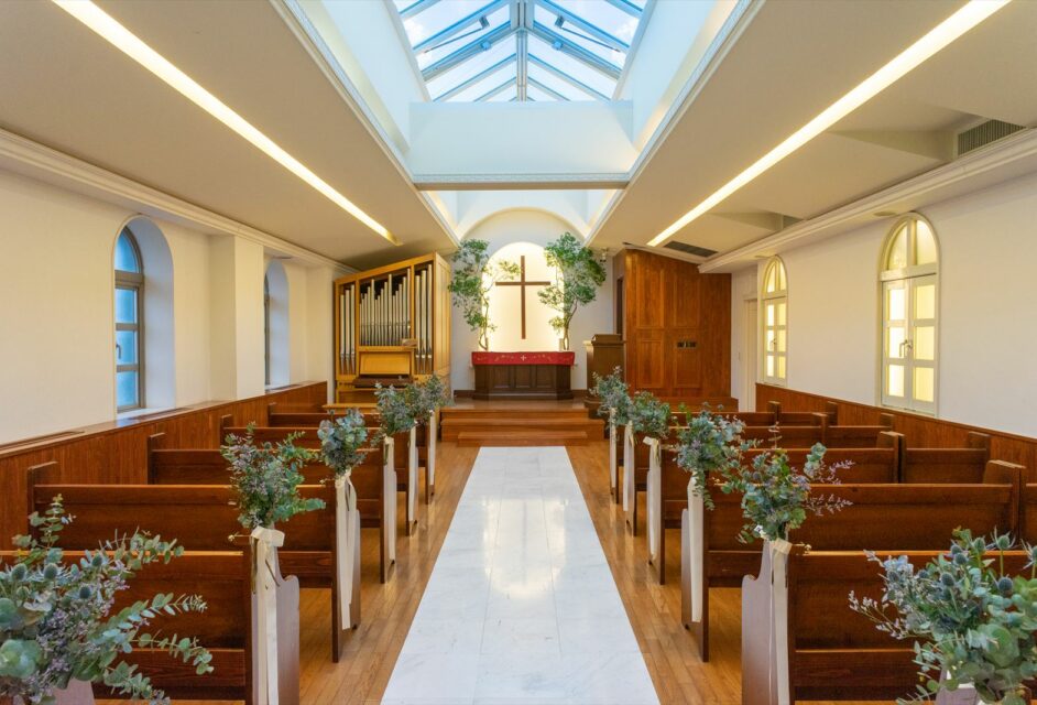 大きな天窓から光が注ぐ、空を感じるスカイルーフチャペル