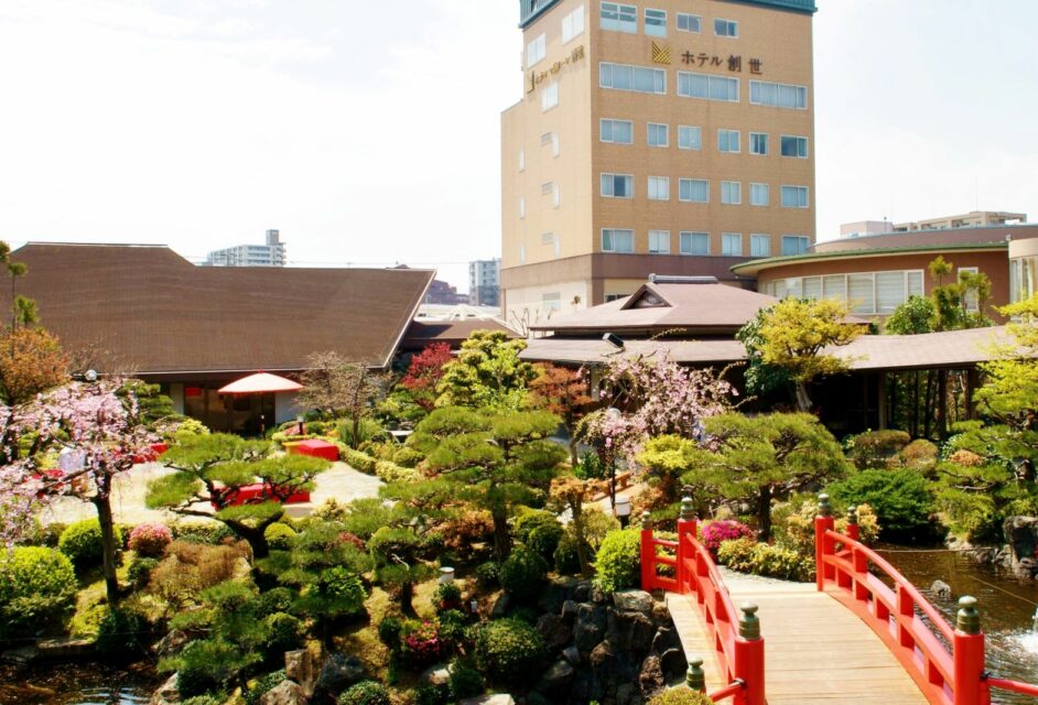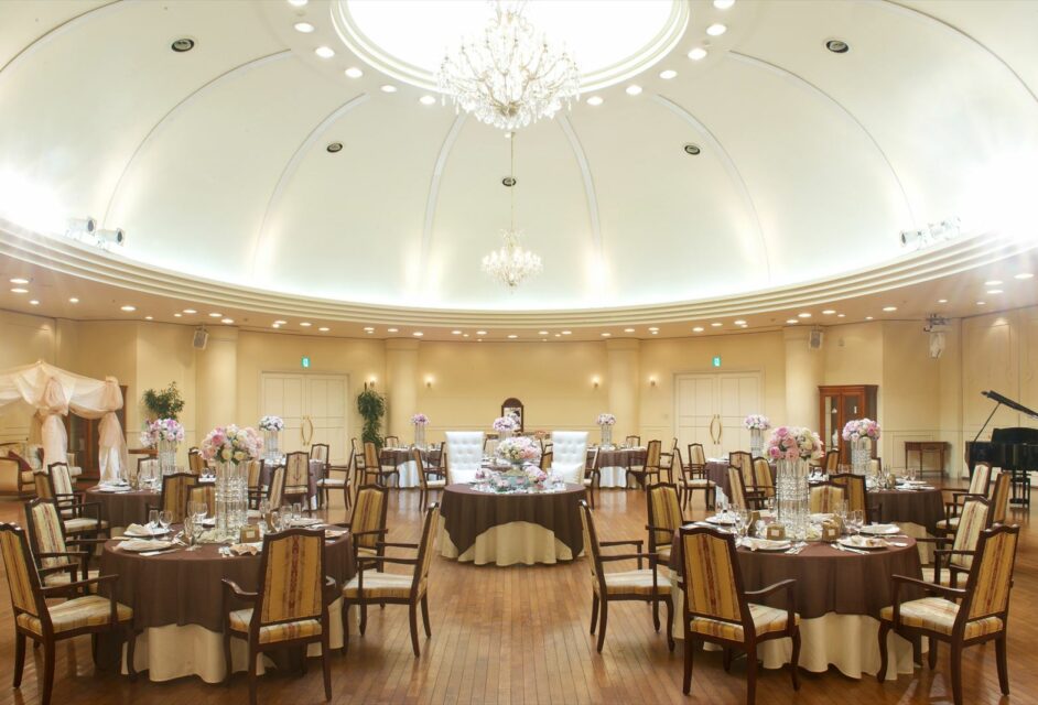 和と洋の美しい庭園が広がる『ホテルマリターレ創世 久留米』。ホテル最上階に位置する「カペラ・テンギョウ」は、優しい自然光が差し込むスカイルーフチャペルで、大きな天窓から青空がのぞく開放的な造り。祭壇の横にはドイツ製のパイプオルガンが配され、厳かな調べがセレモニーを美しく盛り上げる。挙式後は多彩なスタイルのバンケットでおもてなしのパーティを。全館バリアフリー対応になっており、年配ゲストも負担を感じずに過ごすことができる。