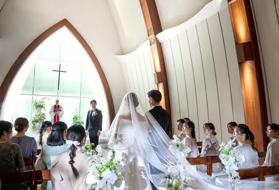 大聖堂の木の温もりに包まれて、家族と誓う特別な一日