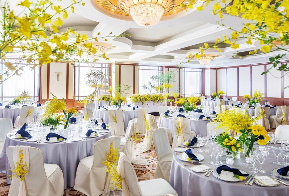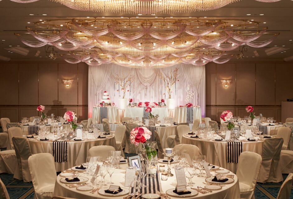 メインバンケット「暁雲」は天井高6mの贅沢な内装のバンケット。市内最大級の広さがあり500名まで着席可能。