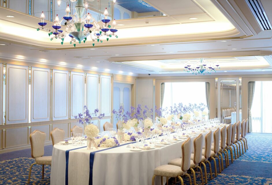 青空に流れる雲をモチーフにした繊細なシャンデリアが印象的な「翠雲」。華やかな光が彩る上品な空間。