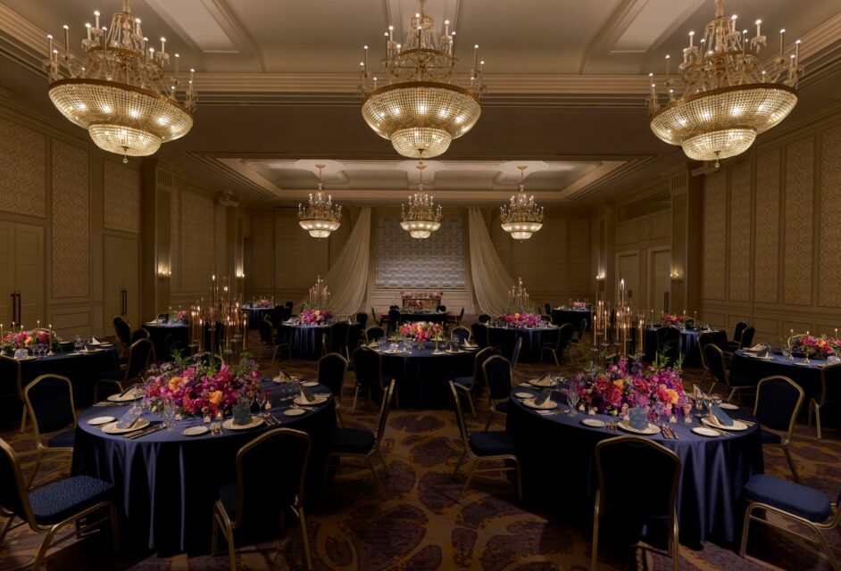 6.5mもの高さの天井にシャンデリアが輝く「エリーゼ」。千葉の海をイメージした青紫色の足元がエレガント。