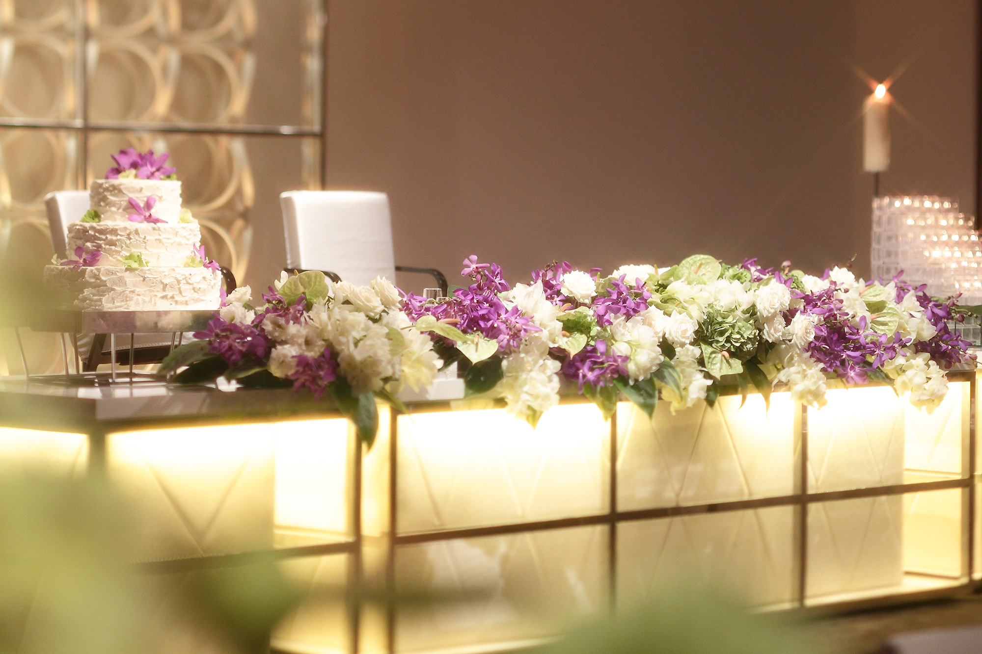 会場「レインボールーム」。メインテーブルには間接照明、背後には指輪がモチーフのライティングウォールが。