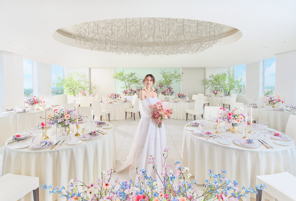 会場「ムーングロー」。何色にも染まるシンプルな白の空間。地上100mの空と装花を生かしてナチュラルにも。