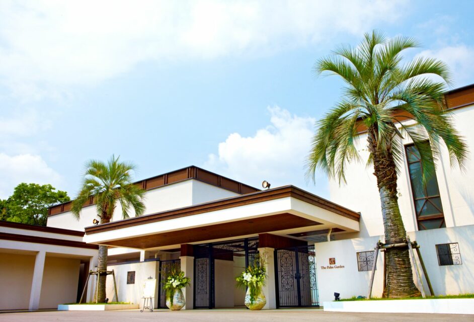 大きな椰子が迎える「ザ・パームガーデン」。一歩足を踏み入れると非日常空間が広がる。100台までの駐車場も。