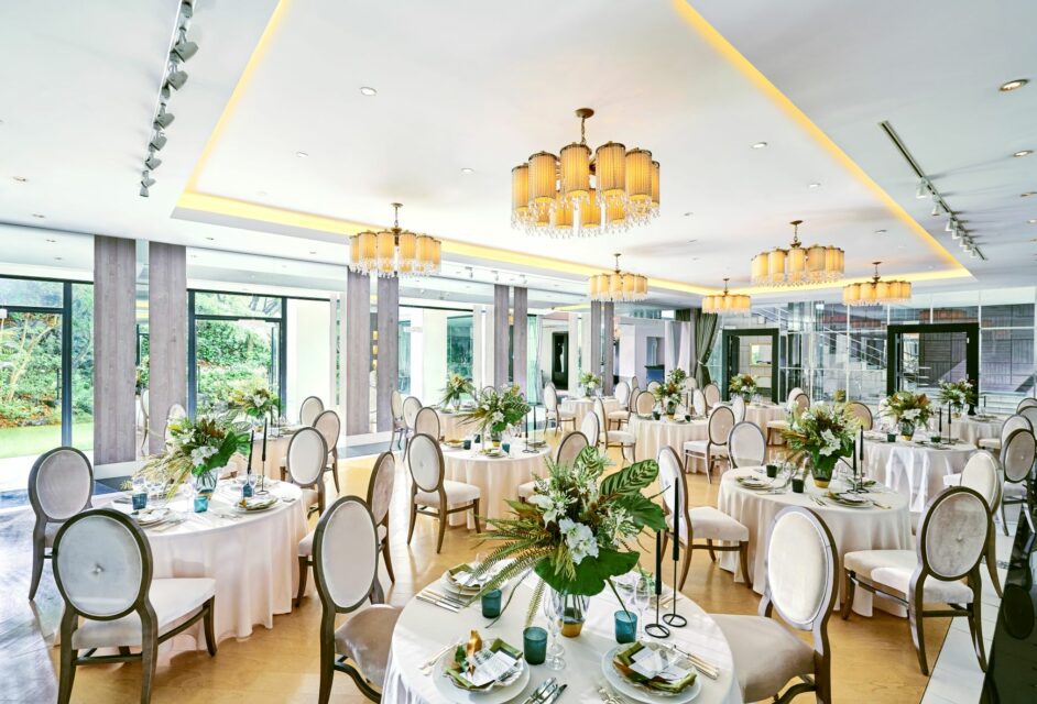 全面にガーデンを臨むバンケット「グランメゾン」。天井が高く自然光に満ちた空間。着席~130名。