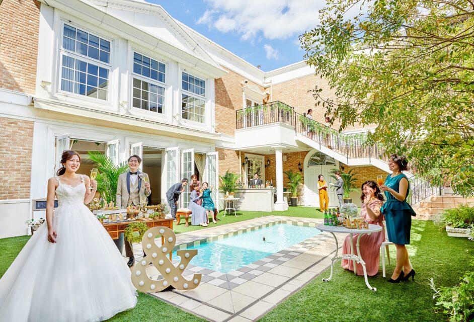 会場「ケント・マナーハウス」にはプール付きのプライベートガーデンも。会場と自由に行き来できる。