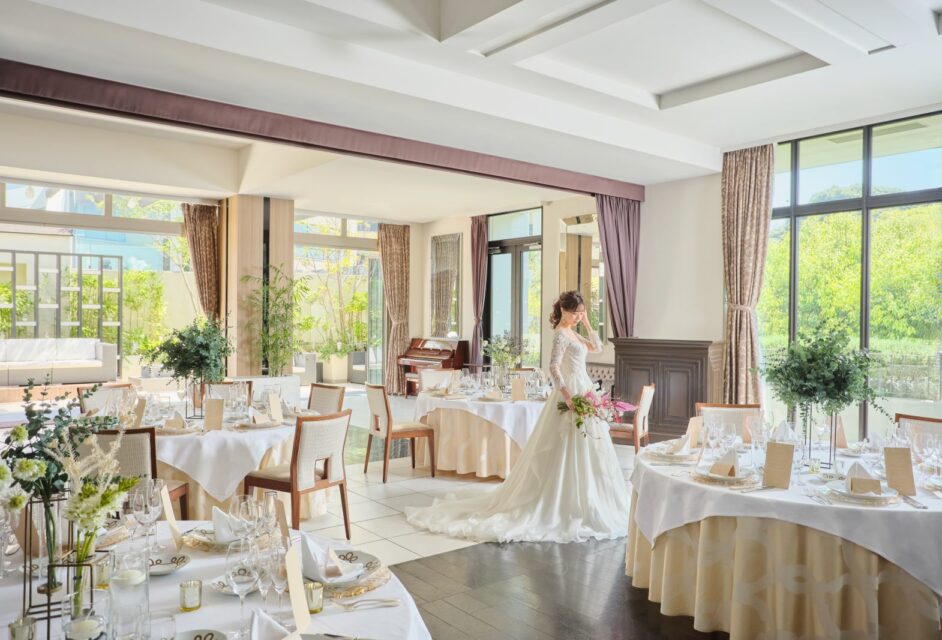 会場「パリブランシェ」(着席~90名)。白を基調とした可憐でロマンティックな会場。プール付きテラス併設。