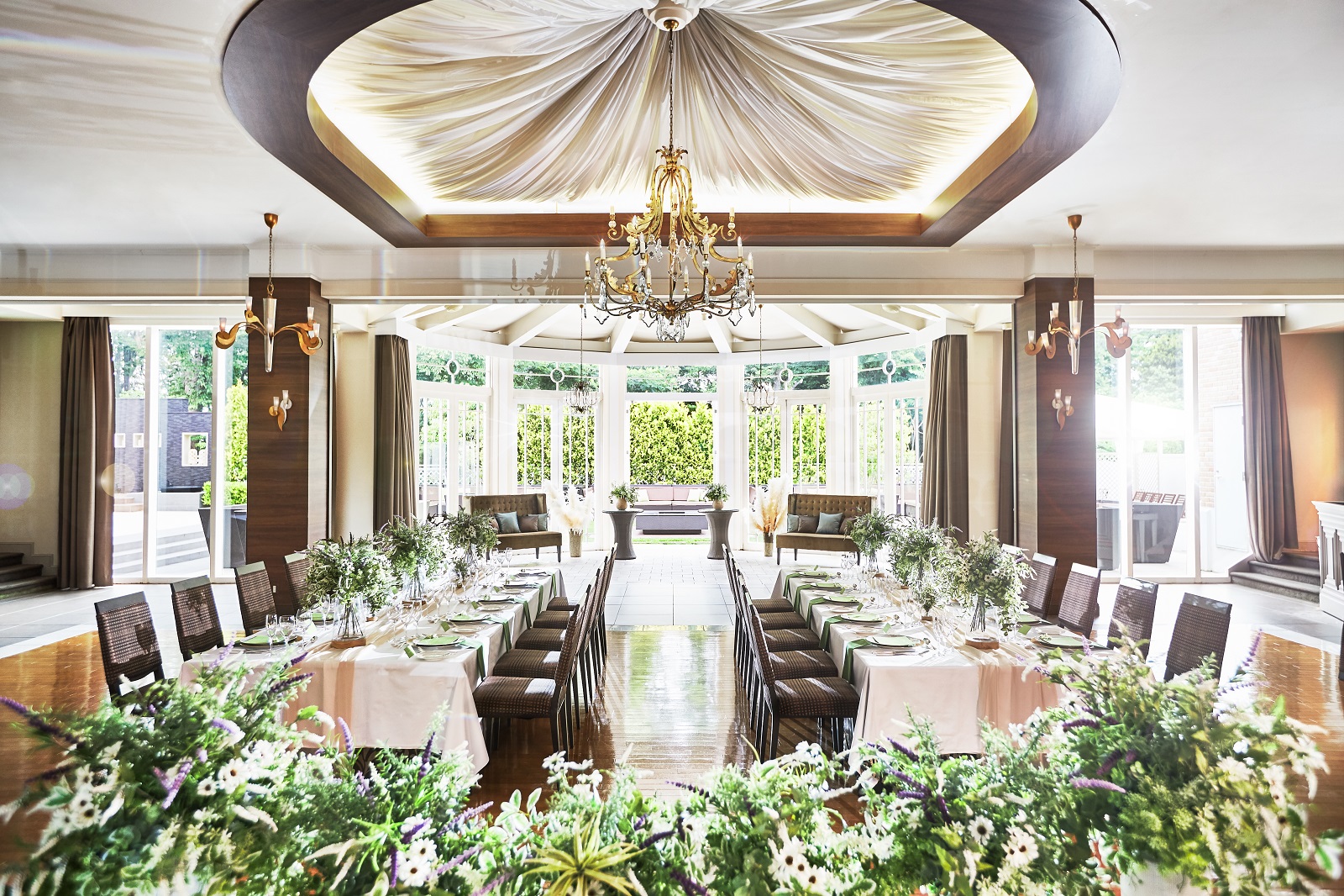 会場「ハンプトンガーデン邸」。ガーデンテラスへと繋がるダイニングルームでは動きのあるパーティが実現。