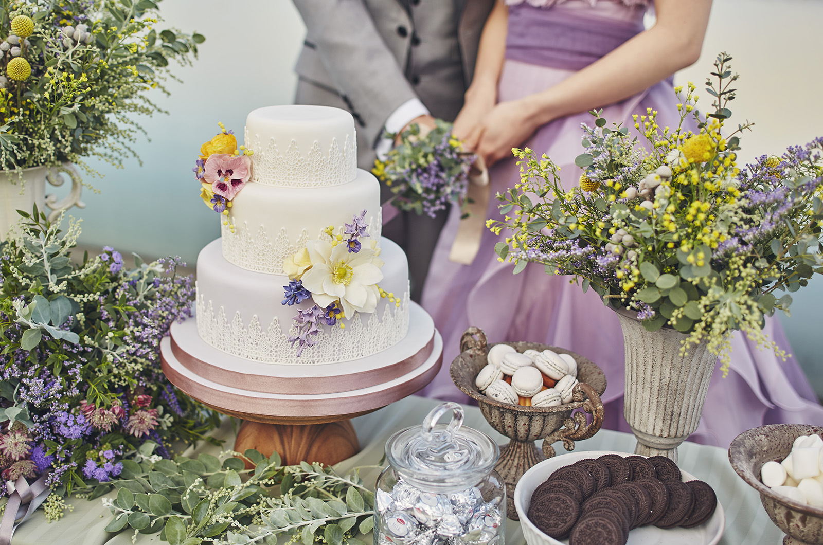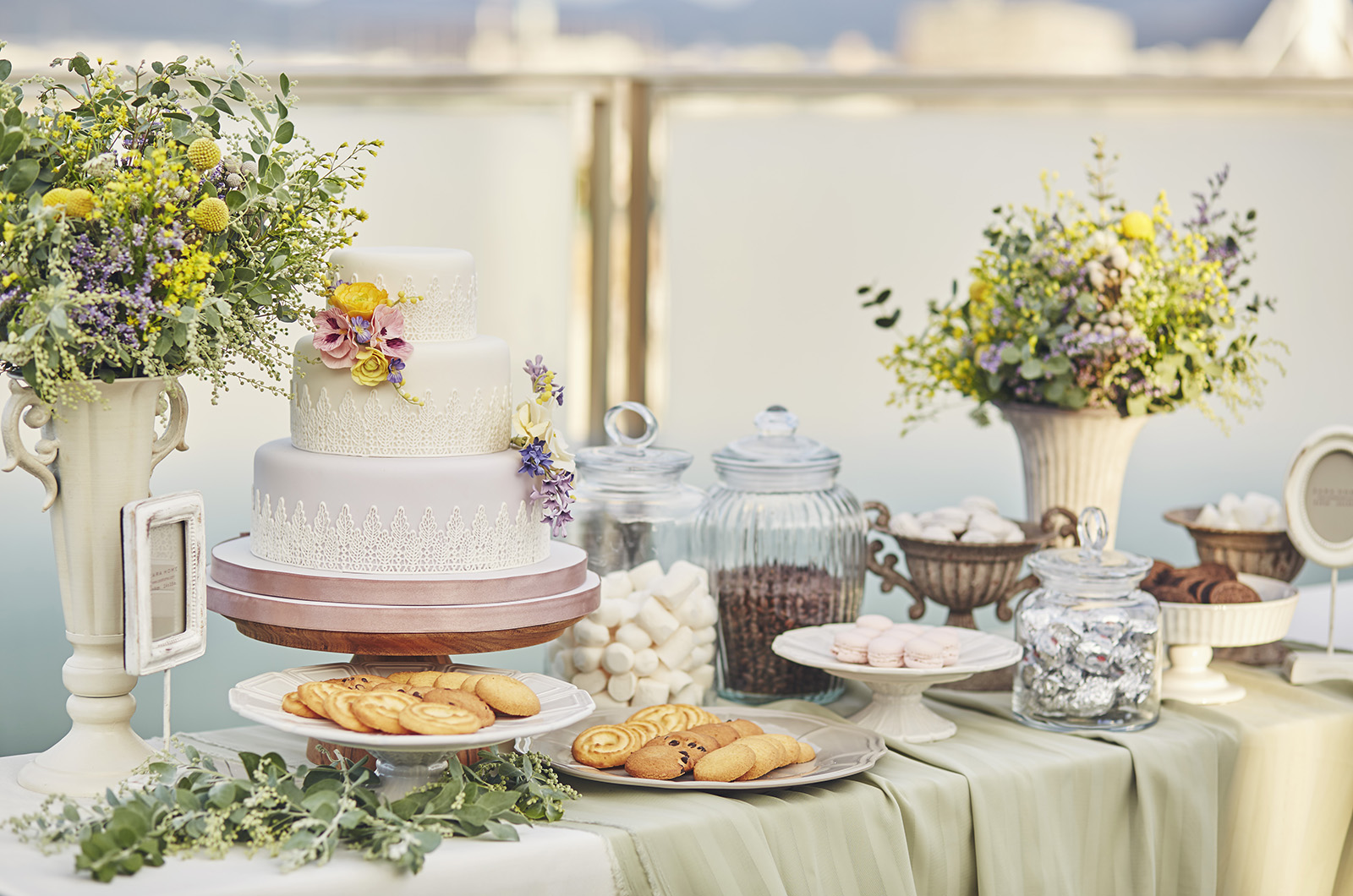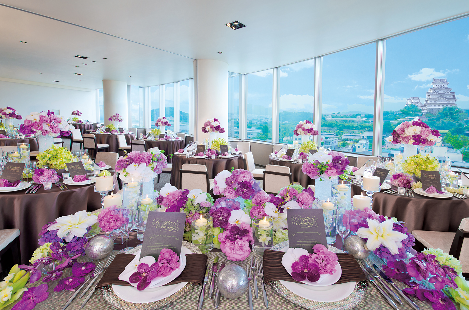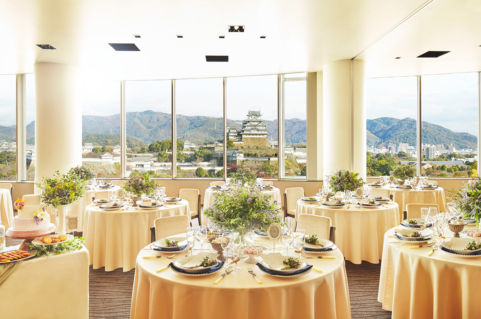 陽光差し込む日中も茜色に染まる夕刻も、窓に映る景色は、おふたりのパーティを優しく包むように華を添える。