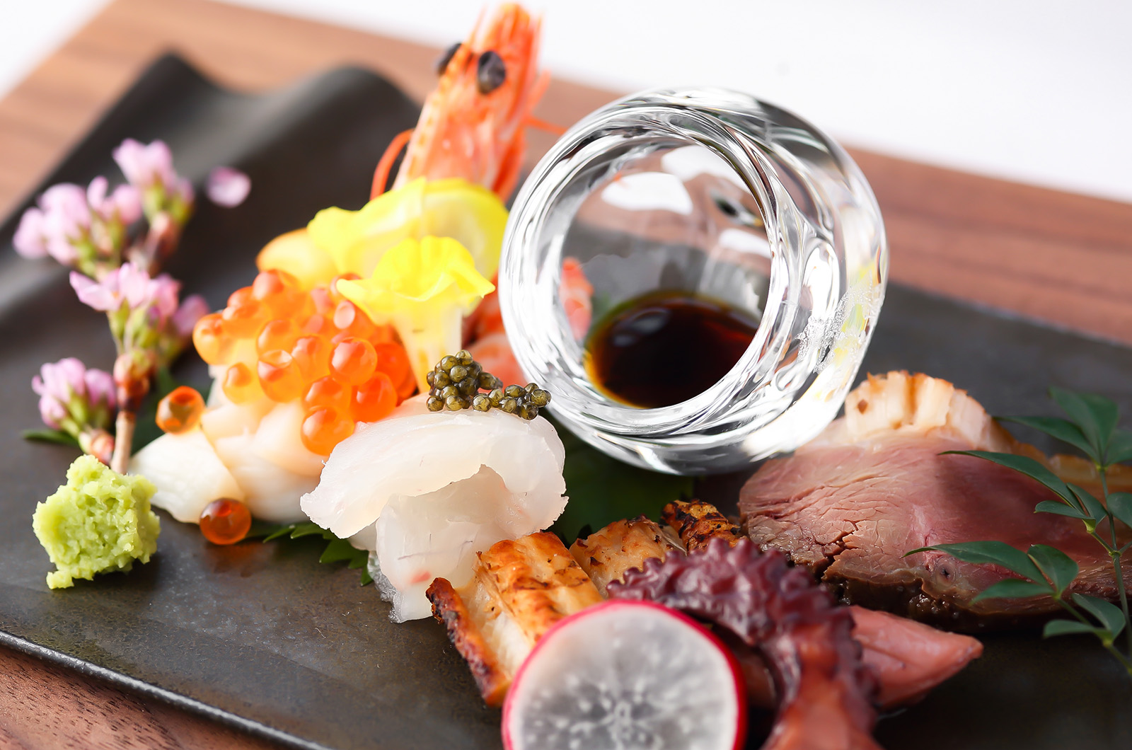 コースで提供される和と洋を組み合わせた和洋折衷料理は、流れのある完成された味を堪能できる。