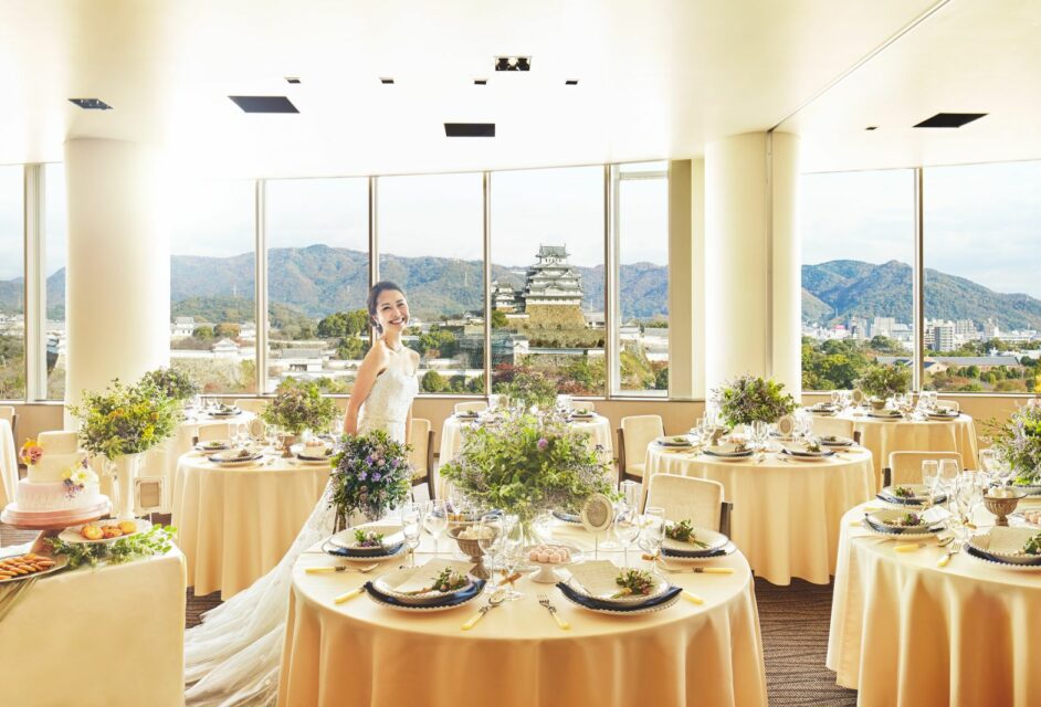 姫路駅より徒歩7分。アクセス便利な大手前通りに面したビルの最上階に位置する「SORA NIWA」。挙式はパーティ会場での宴内人前式。日本初の世界文化遺産となった姫路城を一望。降り注ぐ陽光に包まれて、ここでしか叶えられない温もりに満ちた挙式&パーティが実現。パーティのあとは開放的なテラスでナチュラルな雰囲気の写真撮影を。お料理は、厳選した地元農家やシェフ自らが育てた低農薬・無農薬の野菜を使用したこだわりの和洋折衷メニューに舌鼓を。