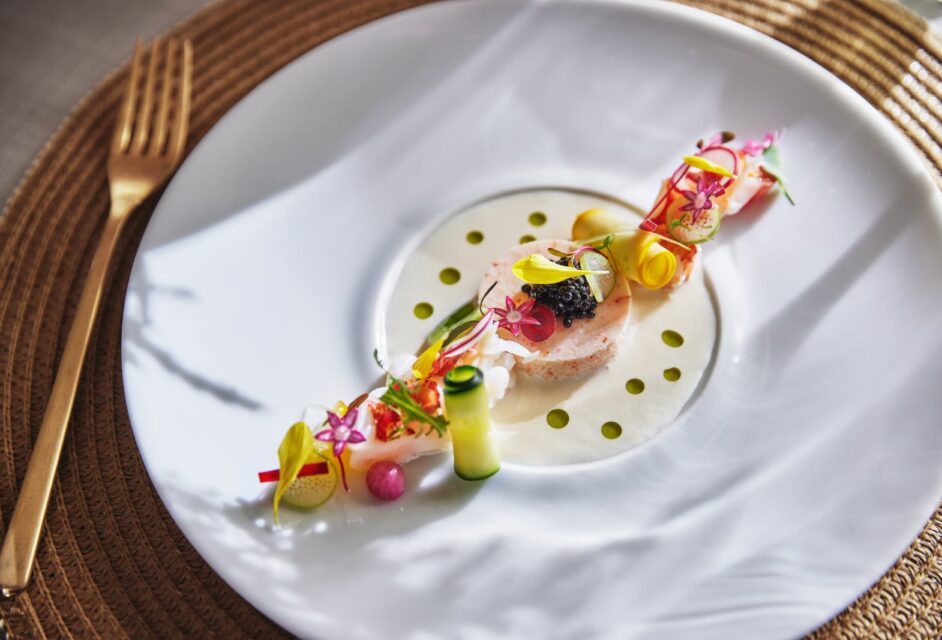 オープンキッチンから伝わる音と香りでゲストの期待を高める数々の料理たち。見た目の美しさにも感動。