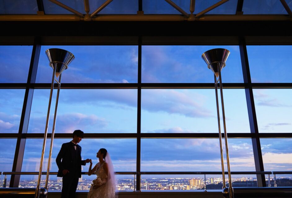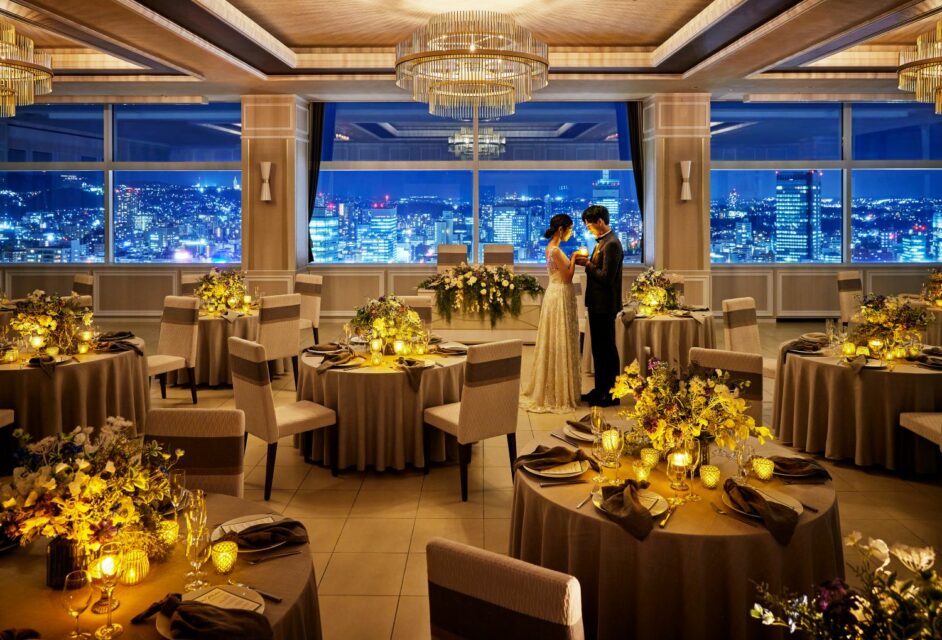 大人の雰囲気が漂うナイトウェディング。「クオリア」から望むパノラマビューはとても幻想的。