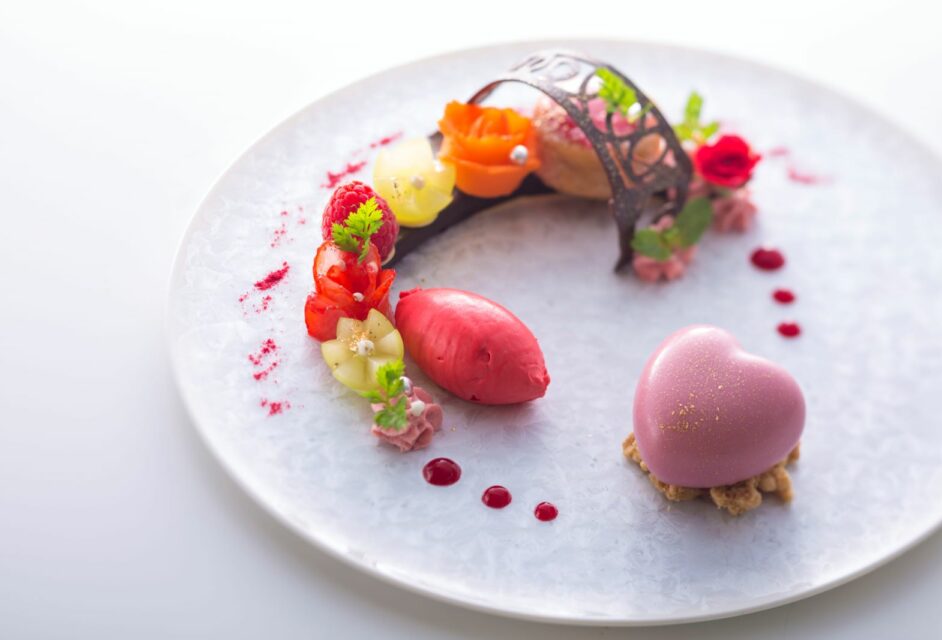 ロビーラウンジのアフタヌーンティーなどを手がけるペストリーシェフがパーティにふさわしいデザート。